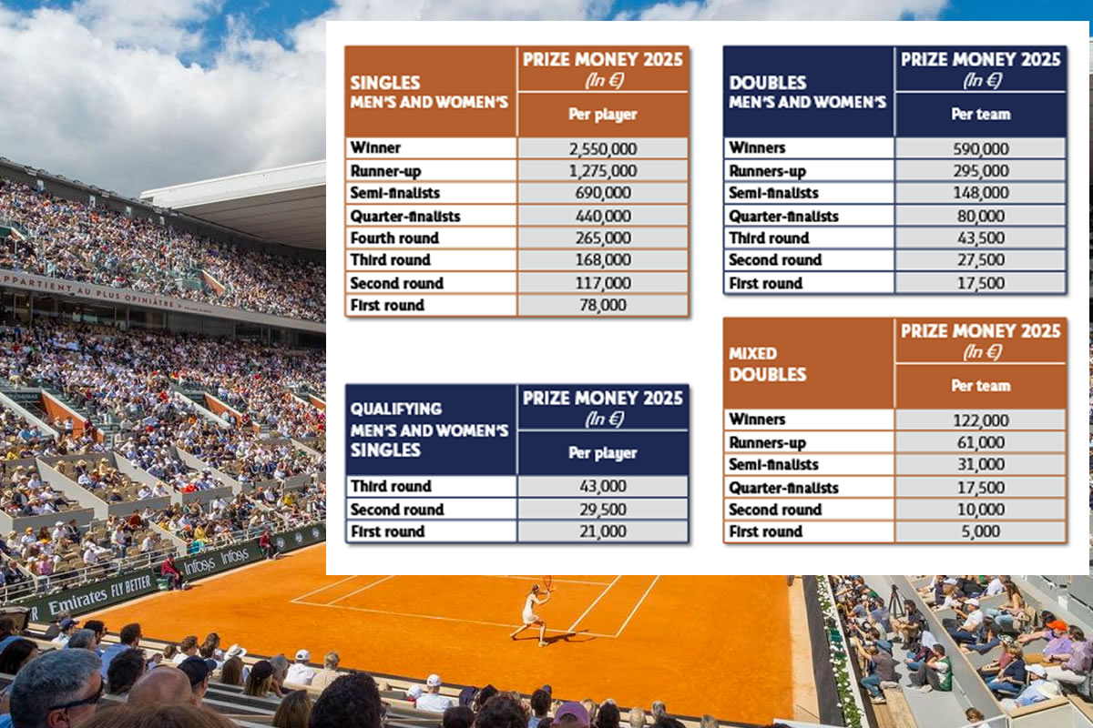 Le principe d’égalité des dotations entre hommes et femmes est désormais bien ancré à Roland-Garros. Cette parité financière se retrouve dans l’intégralité du tableau en simple : le ou la vainqueur(e) empochera 2,550 millions d’euros, tandis que le ou la finaliste repartira avec 1,275 million d’euros. Le gain décroit ensuite progressivement : 690 000 euros pour les demi-finalistes, 440 000 euros pour les quarts de finalistes, jusqu’à 78 000 euros pour une élimination dès le premier tour.